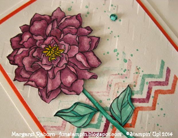 I chose a color scheme of Rich Razzleberry, Calypso Coral and Coastal Cabana with Whisper White.  On the top layer of white cardstock I first stamped the chevron stamp from Work of Art: I inked it with Stampin' Write Markers (water-based) and spritzed it from a distance to get just a small amount of moisture on it then stamped it.  Next, without reinking, I spritzed the chevron stamp again and stamped again, giving a very soft image.  The small scattered dots were stamped using a stamp from the Gorgeous Grunge set with Coastal Cabana ink.